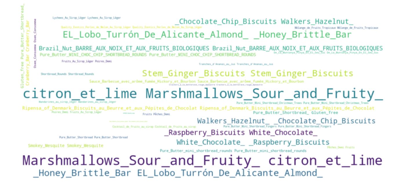 Have a look below, on Word Cloud, the Products containing the most sugars !