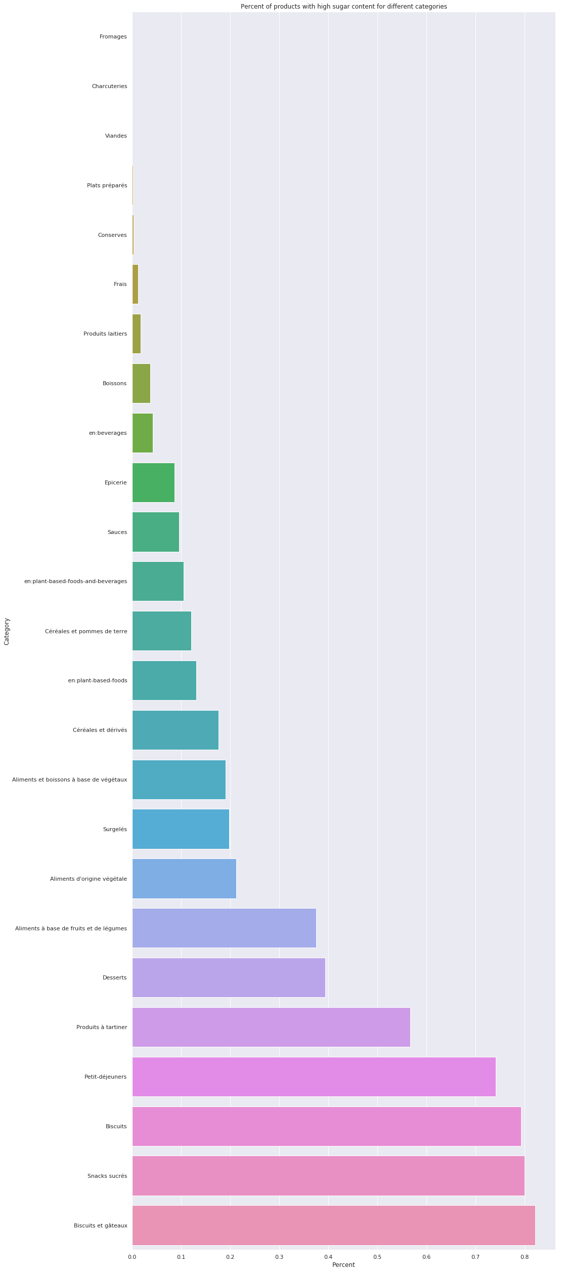 Some overlap seems to still have occured with both biscuits and biscuits and cakes appearing, as well as some mix between english and french category labels. Nevertheless we can clearly see that sweets really live up to their reputation of being sweets, with around 80 percent of all cakes being considered high-sugar, to be consumed only in limited amounts.