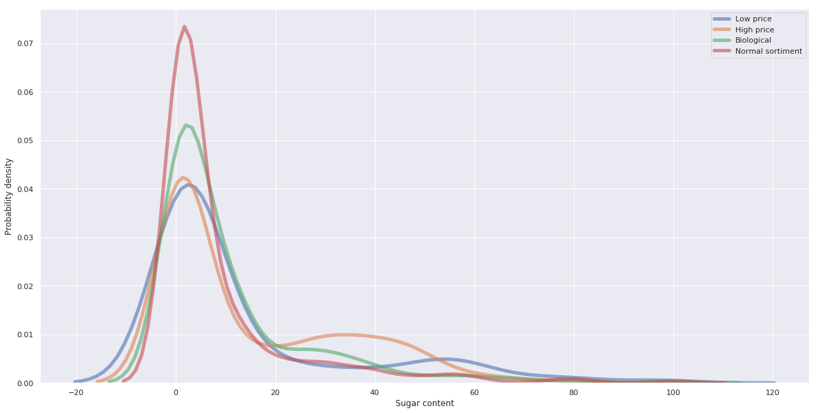 It seems plausible that the high-end products contain more luxury items. Expensive sweets, wine et cetera, which could explain the more sugary content. The normal sortiment is naturally the one most likely to contain a wide range of products and is also the one we have the most data for, reducing the effect of outliers and category bias.