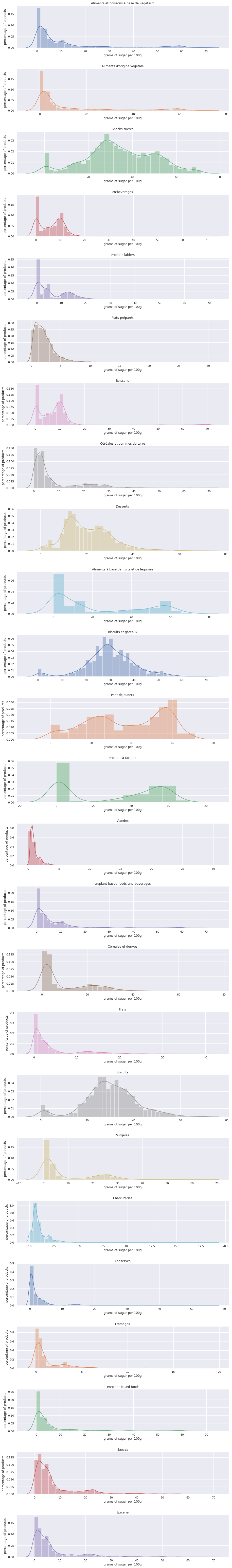 We can safely assume that the majority of sugars come from sweets and the like, but we can do a bit better than just assuming. Keeping in mind that we lose 74% of all data when using categories (as seen in data exploration), let's see how sugar content is distributed in the individual categories.