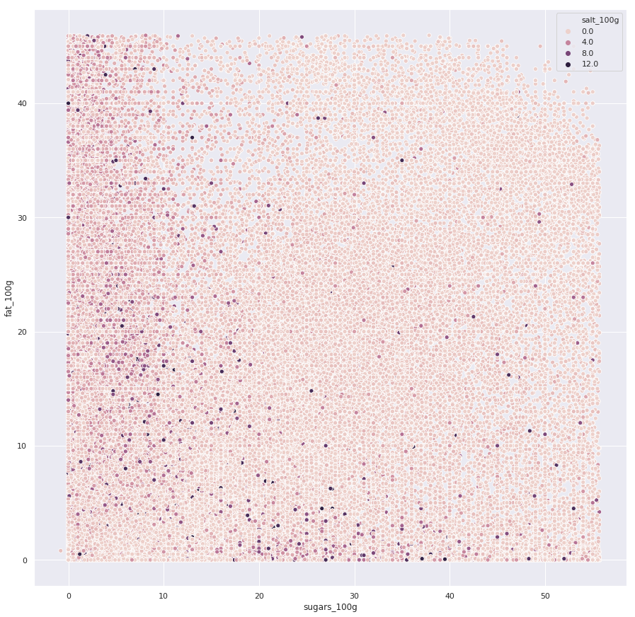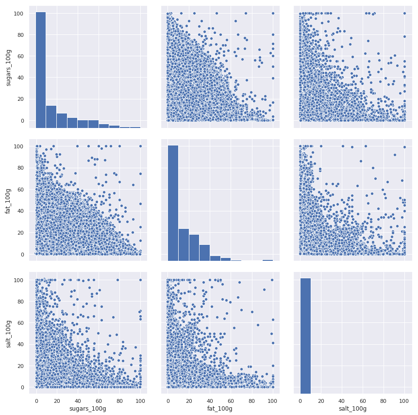 First, the data we are using is essentially how many percent of a product is made of sugar, fat and salt. The total of these values should never add up to more than a hundred, so we would expect all of the points on the scatterplots to remain firmly underneath a diagonal line drawn from the upper left to lower right corner.