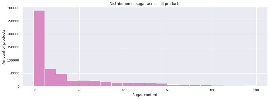 Once more ensuring valid ranges for the data and removing outliers we look at the distribution of sugar for all products we find that 25 % of all products go beyond the previously stated limit, and is thus considered too sugary.